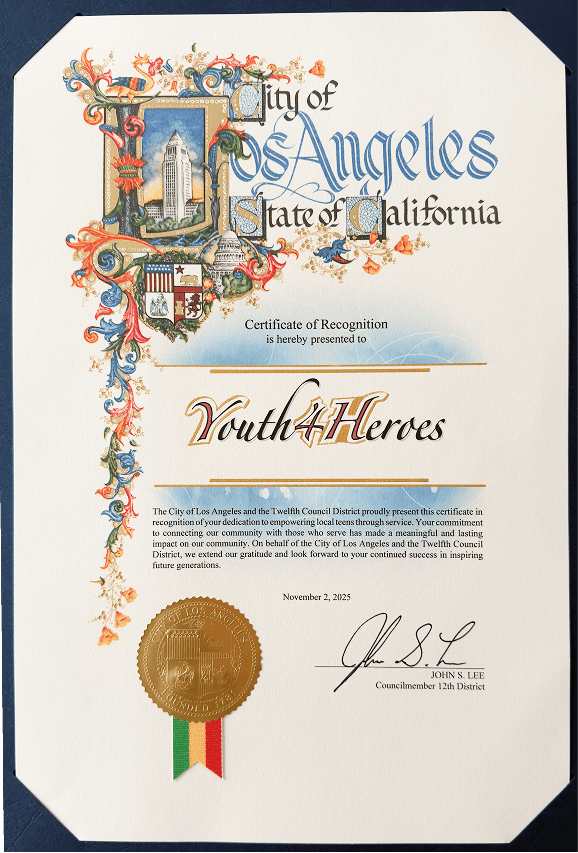 Youth4Heroes is proud to be recognized by the City of Los Angeles and Council District 12 for our student-led commitment to community service.